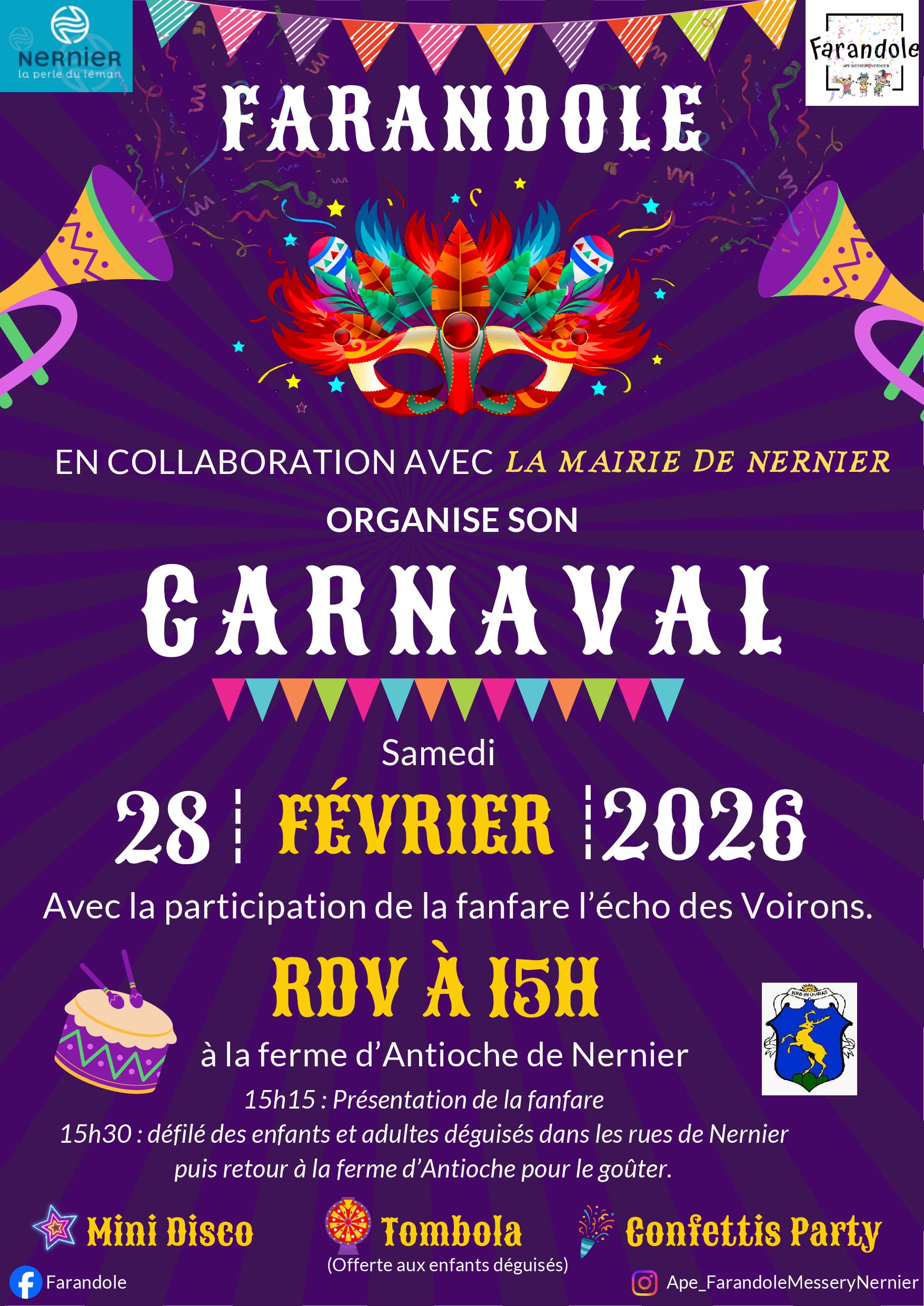 l'APE FARANDOLE, en collaboration avec la Mairie de Nernier, organise son carnaval le samedi 28 février 2026.